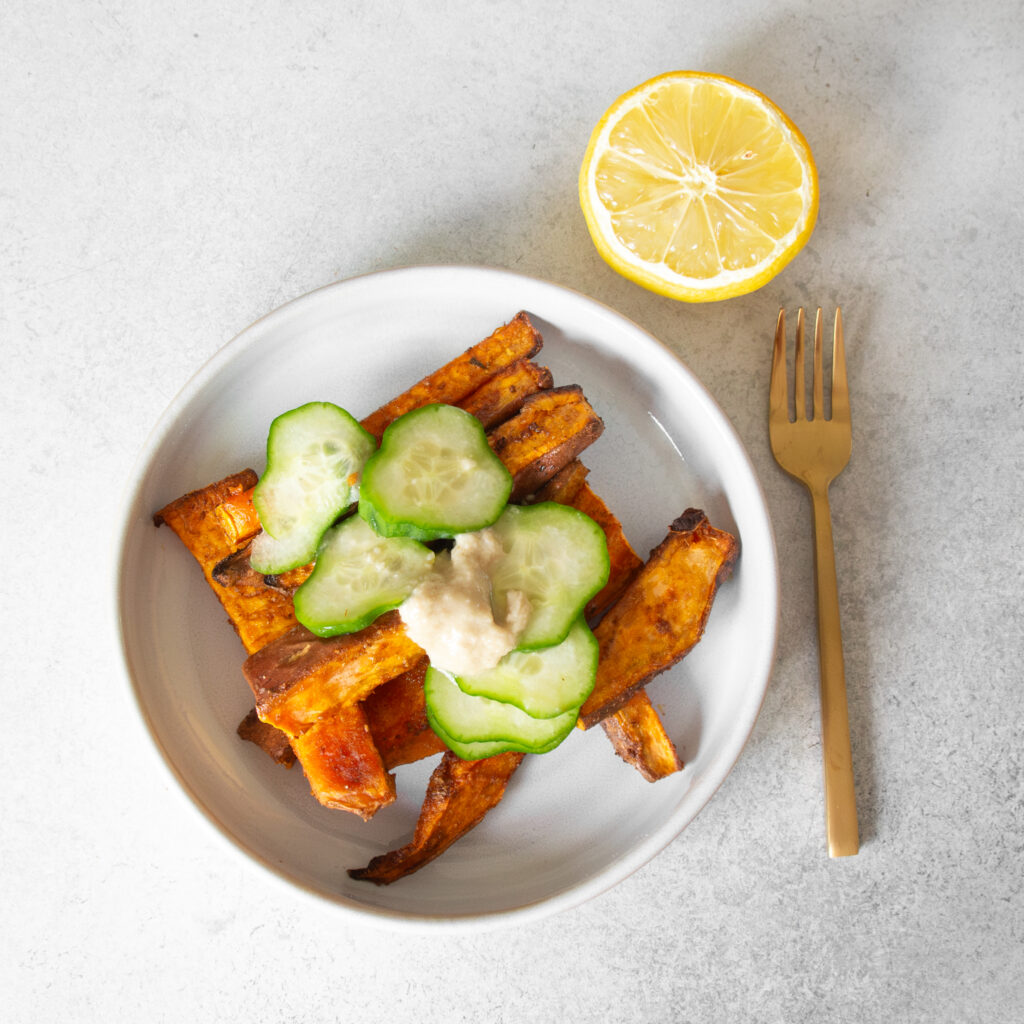 - Heize den Ofen auf 180 Grad Umluft vor. Schneide die Süßkartoffel in Spalten.