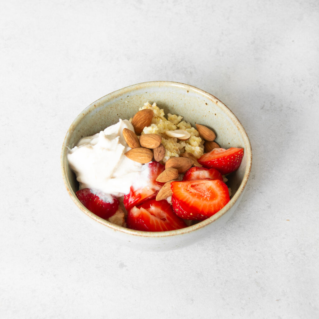 - Mit frischen Beeren, Mandeln und Sojaquark toppen.